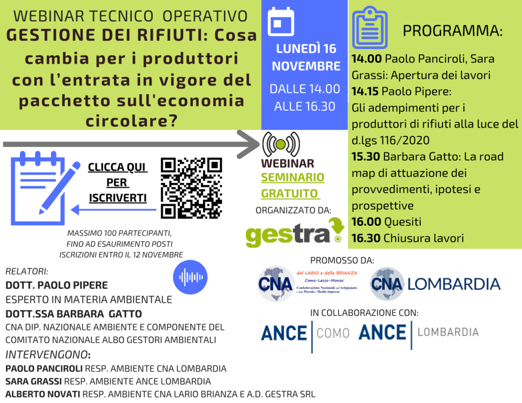 WEBINAR GESTIONE RIFIUTI D.LGS 116/20 NOVEMBRE 2020 + Aggiungi a Google Calendar + Esporta iCal Data Nov 16 2020 Expired! Luogo Go To Meeting Sito web https://www.goto.com/it/meeting Categoria Webinar Organizzatore Gestra SRL Telefono 031 5380061 Email info@gestra.it Condividi questo evento